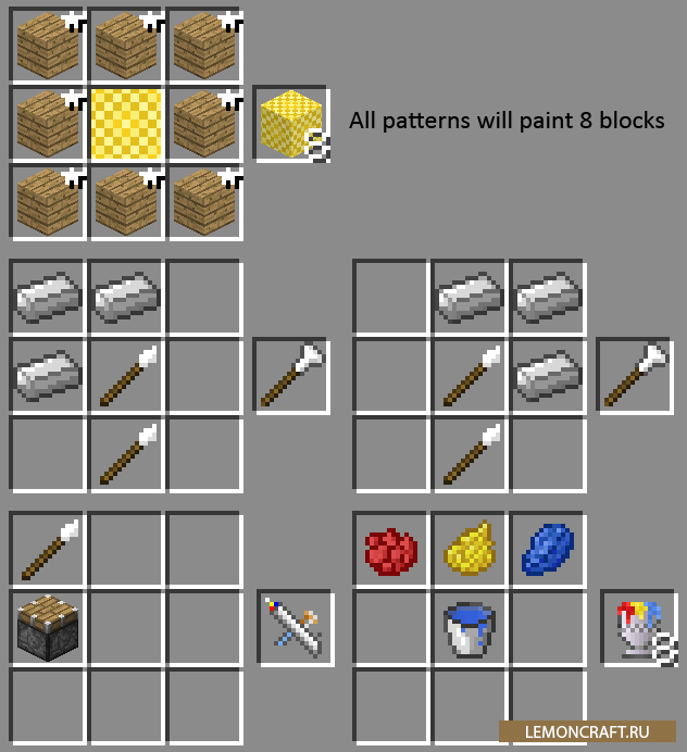 Мод Dooglamoo Painter добавляет возможность рисовать различные узоры на предметах с помощью специальных кистей и узорных блоков. Все узоры можно скрафтить из подручных средств. Теперь можно разукрасить свой дом, придав ему индивидуальность, что будет радовать глаз и украшать саму игру.