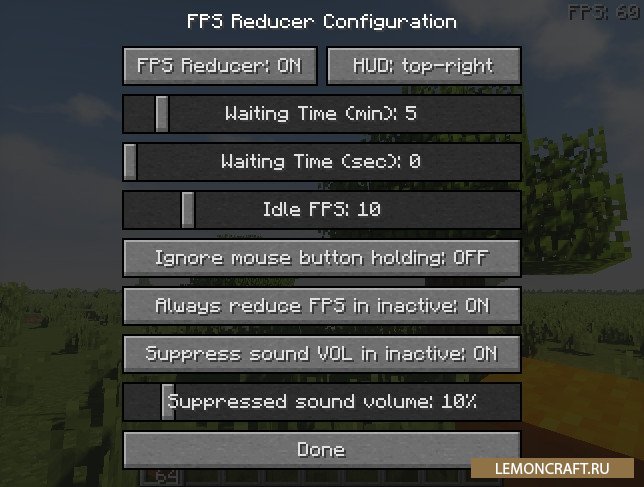 Мод FPS Reducer позволяет снизить нагрузку на компьютер за счет уменьшения количества кадров в секунды - FPS. Данная функция пригодится во время ожидания, когда высокий FPS совершенно не нужен. Включение данной функции происходит автоматически, когда игра свернута или нет никаких действий долгое время. Есть меню настроек, где вы все можете подогнать под себя.