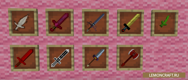 Много различных известных мечей с различными параметрами, вот их список: Demon Sword Finn's Sword Crystal Sword Jake's Sword Paper Sword Gauntlet of Billy Marceline's Axe Bass Crystal Axe Crystal Pickaxe Crystal Hoe Crystal Shovel Root Sword 4-D Sword Blade of Grass