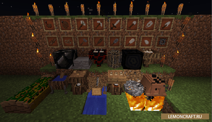 Мод Primal Tech позволит вам осуществлять переработку различных ресурсов используя для этого примитивные технологии. Например, у вас появится глиняная печь, пила, которая будет работать на воде, воду вы будете носить в кожаных мешках, инструменты из кости, травяные факелы. Работа всех этих инструментов полностью анимирована.