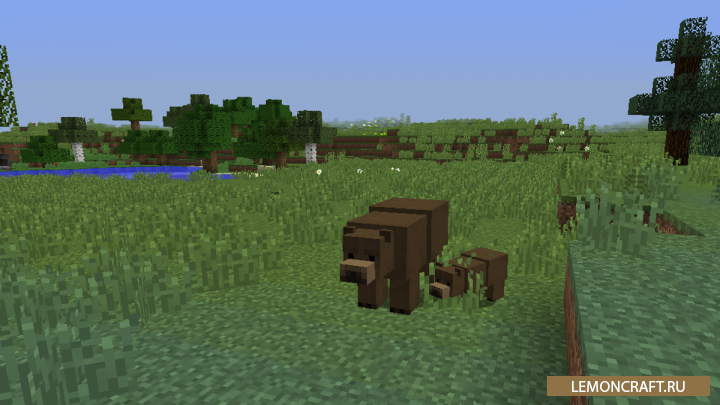 Мод Bear With Me добавляет в игру новых мобов - медведей. Теперь играя в игру майнкрафт вы сможете познакомиться с такими видами медведей, как гризли, панда и черный медведь. Каждый медведь имеет свое количество здоровья, больше никаких преимуществ друг перед другом они не имеют. С медведя вы можете получить шкуру и переделать ее в обычную кожу.