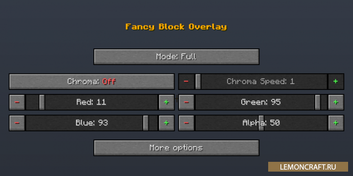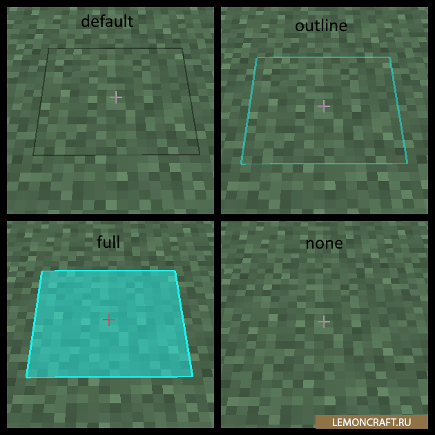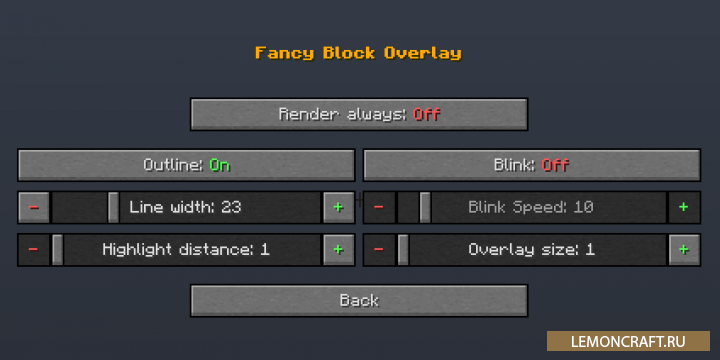 Fancy Block Overlay дает вам возможность изменить рамку для блока. С помощью этого мода вы можете изменить цвет рамки, толщину линии, ее прозрачность. Так же вы можете совсем убрать рамку или сделать так, что бы она закрывала весь блок. Кроме этого можно настроить дистанцию с которой данная обводка будет видна.