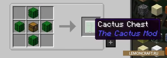The Cactus Mod добавляет в игру возможность скрафтить из кактуса различные предметы и аксессуары. Большинство получаемых предметов не несут никакой полезной функции, но зато они из кактуса. Но с другой стороны крафт данных предметов не очень дорогой, что позволит вам быстрее развиваться и продвигаться в вашем игровом мире.