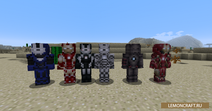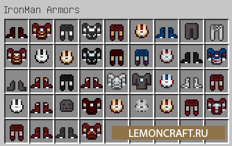 Мод на костюм железного человека IronMan позволит вам примерять костюм железного человека, а так же возможность летать и стрелять с его помощью. Мод добавит в игру несколько видов костюма железного человек, для создания которых вы должны будете освоить новые технологии и выработку энергии. Мод не использует ванильных руд, а добавляет новые руды и металлы, из которых вы будете создавать новую броню. Благодаря сторонним модам (Ender IO или Thermal Expansion) производятся технические компоненты для костюмов. Все костюмы позволят вам летать и стрелять.