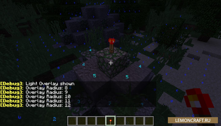 Мод на отображение уровня освещенности Simple Light Overlay является небольшим информационным модом, который позволит следить за уровнем освещенности на блоках. Используя клавишу F12 вы сможете включать и отключать данный режим. Используя клавиши Page Up и Page Down вы сможете настроить радиус действия данного мода.