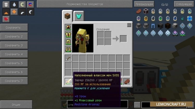 Мод на перезаряжаемое оружие Redstone Arsenal добавит в игру новый материал, который позволит вам создавать оружие, броню и инструменты, которые можно будет заряжать RF-энергией. Предметы созданные по данной технологии имеют большую мощность, чем обычные, но при этом и расход энергии идет в разы больше. Мод добавляет все, что нужно для создания брони, инструментов и оружия, но не добавляет машин для получения энергии, поэтому нужно устанавливать дополнительные моды.