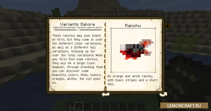 Мод на золотых рыбок Baby Fat добавляет в игру новый вид милых рыбок, которые разнообразят морскую фауну, став отличным дополнением к общей массе водных живых существ. Всего будет добавлено 3 вида новых рыбок, но используя метод скрещивания, вы сможете вывести более 300 видов. Так же в игре появятся новые водные растения, которые нужно использовать в качестве корма для рыбок. Найти данные растения вы сможете в озёрах и реках саванны.